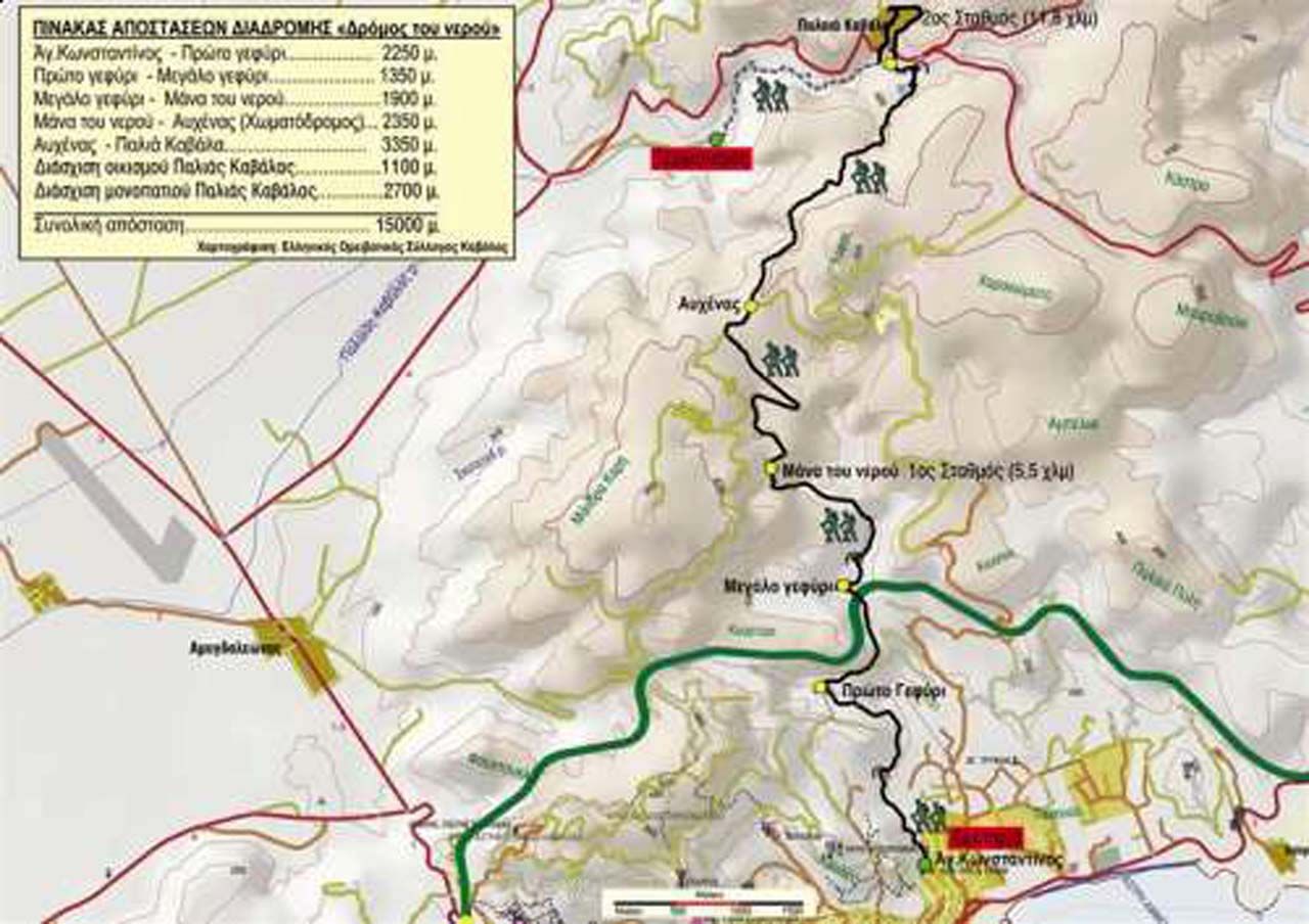 Πρόκειται για μια διαδρομή 10 χιλιομέτρων περίπου, που ξεκινά από την Παλιά Καβάλα και καταλήγει στη περιοχή Άγιος Κωνσταντίνος της Καβάλας, είναι δε γνωστή και ως "δρόμος του νερού". Ο επισκέπτης μπορεί να τη συνδιάσει περπατώντας και το μονοπάτι της Παλιάς Καβάλας, καθώς οι δυο διαδρομές συνδέονται. Συγκεκριμένα, στο σημείο που τερματίζει το περιβαλλοντικό μονοπάτι της Παλιάς Καβάλας - κάτω από το χωριό - , υπάρχει ένας χωματόδρομος 100μ. περίπου που οδηγεί σε ένα παλιό γεφύρι. Μετά το γεφύρι ακολουθεί ένα ανηφορικό μονοπάτι που καταλήγει σε μια στέρνα, στη θέση ''Καρυδιές'', ακριβώς απέναντι από το χωριό. Πάνω από τη στέρνα υπάρχει ένα μονοπάτι με κλήση ανηφορική και κατεύθυνση προς νότο. Ο περιπατητής θα το ακολουθήσει, έχοντας στα αριστερα του τον αναρριχητικό βράχο και στα δεξιά τον κάμπο των Φιλίππων. Μετά από 3 χιλ. περίπου θα φτάσει στον αυχένα, όπου θα αντικρίσει το κόλπο της Καβάλας και το νησί της Θάσου. Εκεί θα συναντήσει ένα χωματόδρομο και θα κατευθυνθεί δεξιά, μετά από 2 χιλ. περίπου, θα στρίψει αριστερά σ'ένα κατηφορικό δρόμο για να προσεγγίσει τη περιοχή "Τρία καραγάτσια" ή ''Μάνα του νερού''. Βρισκόμαστε στο 5 χιλιόμετρο, περίπου στo μέσον της διαδρομής. Εκεί θα συναντήσει ένα εγκαταλειμμένο αγρόκτημα και μια στέρνα με άφθονο νερό. Αφού δροσιστεί εκεί, θα διαβεί ένα μονοπάτι που το προδίδουν οι πλάκες από το επίγειο αγωγό ύδρευσης. Θα ακολουθήσει μια διαδρομή 2 χιλ. περίπου, μέσα σε μια χαράδρα με πυκνή βλάστηση και κατά μήκως μιας ρεματιάς, για να φτάσει στο μεγάλο γεφύρι. Στη συνέχεια, μετά από 1,5 χιλ. πορεία, θα φτάσει έως το τελευταίο γεφύρι πριν τη Καβάλα. Απομένουν άλλα 2 χιλ. πεζοπορείας, έως τον Άγιο Κωνσταντίνο. Στο δεύτερο μισό της διαδρομής ο διαβάτης, θα διαβεί καλοδουλεμένα αυλάκια, καλυμμένα με λαξεμένες πέτρες, θα περάσει πάνω από πέντε γέφυρες, επιδέξιας αρχιτεκτονικής και θα έχει την ευκαιρία να γνωρίσει από κοντά ένα θαυμαστό για την εποχή του έργο, χάρις το οποίο υδροδοτήθηκε η Καβάλα για πολλά χρόνια. Πέρα από την ιστορική και πολιτισμική αξία της διαδρομής, είναι ιδιαίτερα εντυπωσιακή η εναλλαγή παραστάσεων από την ορεινή φύση και εικόνων από τον κάμπο των Φιλίππων, το όρος Παγγαίο, το Θασιακό πέραμα και το κόλπο της Καβάλας. Η διαδρομή μπορεί να γίνει φυσικά και αντίστροφα από τον Άγιο Κωνσταντίνο Καβάλας, στο τέρμα της οδού 13ης Σεπτεμβρίου, με κατεύθυνση τη Παλαιά Καβάλα.
