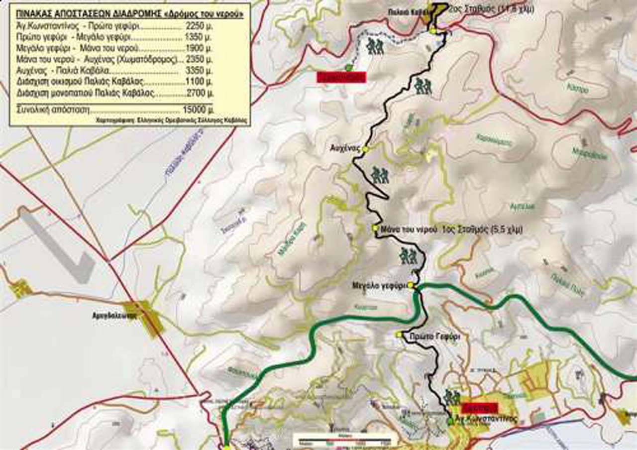 Πρόκειται για μια διαδρομή 10 χιλιομέτρων περίπου, που ξεκινά από την Παλιά Καβάλα και καταλήγει στη περιοχή Άγιος Κωνσταντίνος της Καβάλας, είναι δε γνωστή και ως "δρόμος του νερού". Ο επισκέπτης μπορεί να τη συνδιάσει περπατώντας και το μονοπάτι της Παλιάς Καβάλας, καθώς οι δυο διαδρομές συνδέονται. Συγκεκριμένα, στο σημείο που τερματίζει το περιβαλλοντικό μονοπάτι της Παλιάς Καβάλας - κάτω από το χωριό - , υπάρχει ένας χωματόδρομος 100μ. περίπου που οδηγεί σε ένα παλιό γεφύρι. Μετά το γεφύρι ακολουθεί ένα ανηφορικό μονοπάτι που καταλήγει σε μια στέρνα, στη θέση ''Καρυδιές'', ακριβώς απέναντι από το χωριό. Πάνω από τη στέρνα υπάρχει ένα μονοπάτι με κλήση ανηφορική και κατεύθυνση προς νότο. Ο περιπατητής θα το ακολουθήσει, έχοντας στα αριστερα του τον αναρριχητικό βράχο και στα δεξιά τον κάμπο των Φιλίππων. Μετά από 3 χιλ. περίπου θα φτάσει στον αυχένα, όπου θα αντικρίσει το κόλπο της Καβάλας και το νησί της Θάσου. Εκεί θα συναντήσει ένα χωματόδρομο και θα κατευθυνθεί δεξιά, μετά από 2 χιλ. περίπου, θα στρίψει αριστερά σ'ένα κατηφορικό δρόμο για να προσεγγίσει τη περιοχή "Τρία καραγάτσια" ή ''Μάνα του νερού''. Βρισκόμαστε στο 5 χιλιόμετρο, περίπου στo μέσον της διαδρομής. Εκεί θα συναντήσει ένα εγκαταλειμμένο αγρόκτημα και μια στέρνα με άφθονο νερό. Αφού δροσιστεί εκεί, θα διαβεί ένα μονοπάτι που το προδίδουν οι πλάκες από το επίγειο αγωγό ύδρευσης. Θα ακολουθήσει μια διαδρομή 2 χιλ. περίπου, μέσα σε μια χαράδρα με πυκνή βλάστηση και κατά μήκως μιας ρεματιάς, για να φτάσει στο μεγάλο γεφύρι. Στη συνέχεια, μετά από 1,5 χιλ. πορεία, θα φτάσει έως το τελευταίο γεφύρι πριν τη Καβάλα. Απομένουν άλλα 2 χιλ. πεζοπορείας, έως τον Άγιο Κωνσταντίνο. Στο δεύτερο μισό της διαδρομής ο διαβάτης, θα διαβεί καλοδουλεμένα αυλάκια, καλυμμένα με λαξεμένες πέτρες, θα περάσει πάνω από πέντε γέφυρες, επιδέξιας αρχιτεκτονικής και θα έχει την ευκαιρία να γνωρίσει από κοντά ένα θαυμαστό για την εποχή του έργο, χάρις το οποίο υδροδοτήθηκε η Καβάλα για πολλά χρόνια. Πέρα από την ιστορική και πολιτισμική αξία της διαδρομής, είναι ιδιαίτερα εντυπωσιακή η εναλλαγή παραστάσεων από την ορεινή φύση και εικόνων από τον κάμπο των Φιλίππων, το όρος Παγγαίο, το Θασιακό πέραμα και το κόλπο της Καβάλας. Η διαδρομή μπορεί να γίνει φυσικά και αντίστροφα από τον Άγιο Κωνσταντίνο Καβάλας, στο τέρμα της οδού 13ης Σεπτεμβρίου, με κατεύθυνση τη Παλαιά Καβάλα.